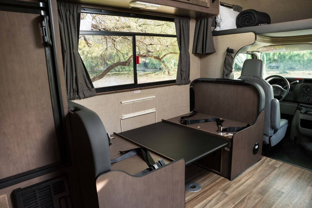 Ideal for families or small groups, featuring multiple sleeping options including a convertible dinette and a cab-over bed.