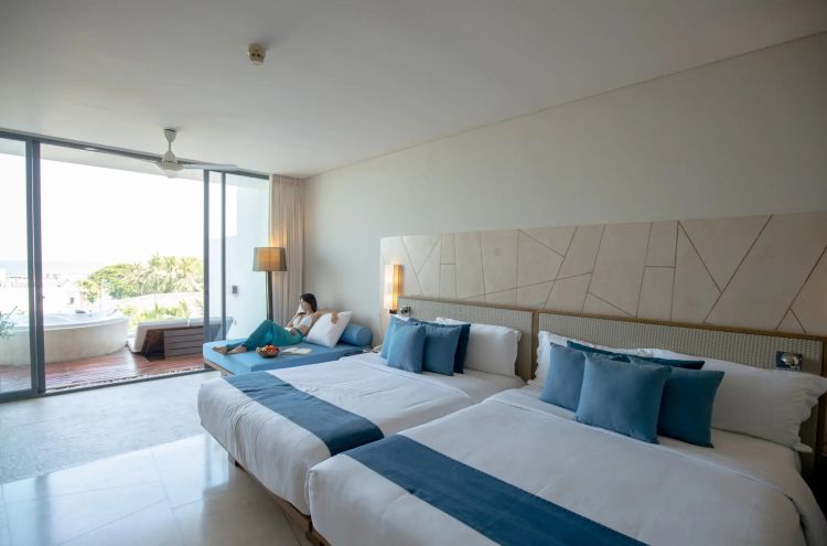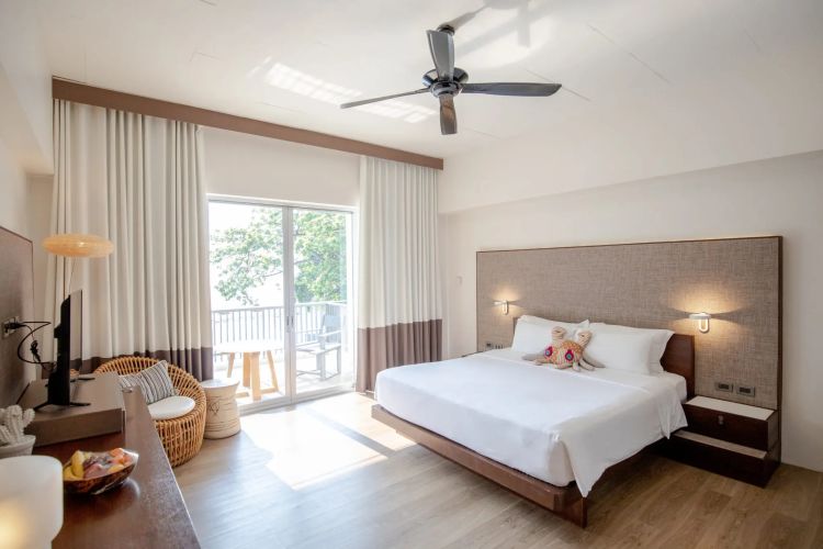 Enjoy a spacious room with a balcony overlooking the ocean, perfect for a romantic moment with your loved one. The stylish décor and peaceful view create an ideal environment for relaxation and comfort.