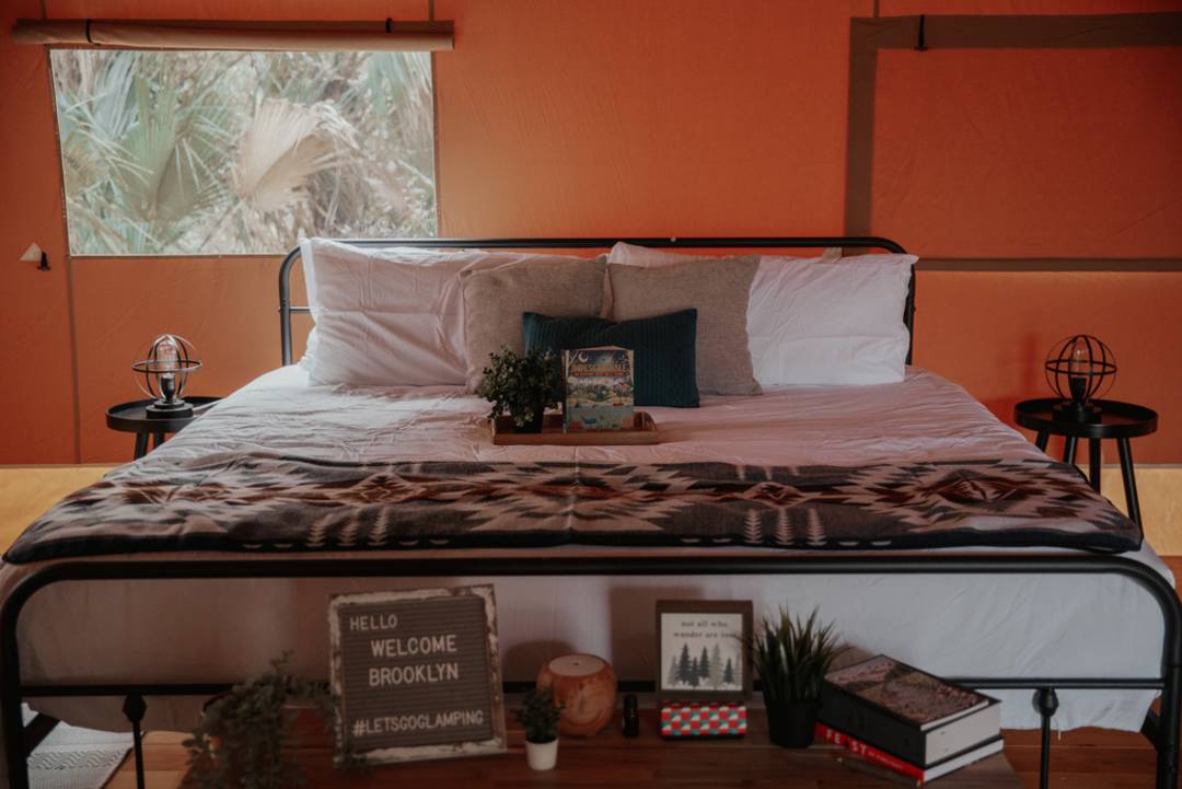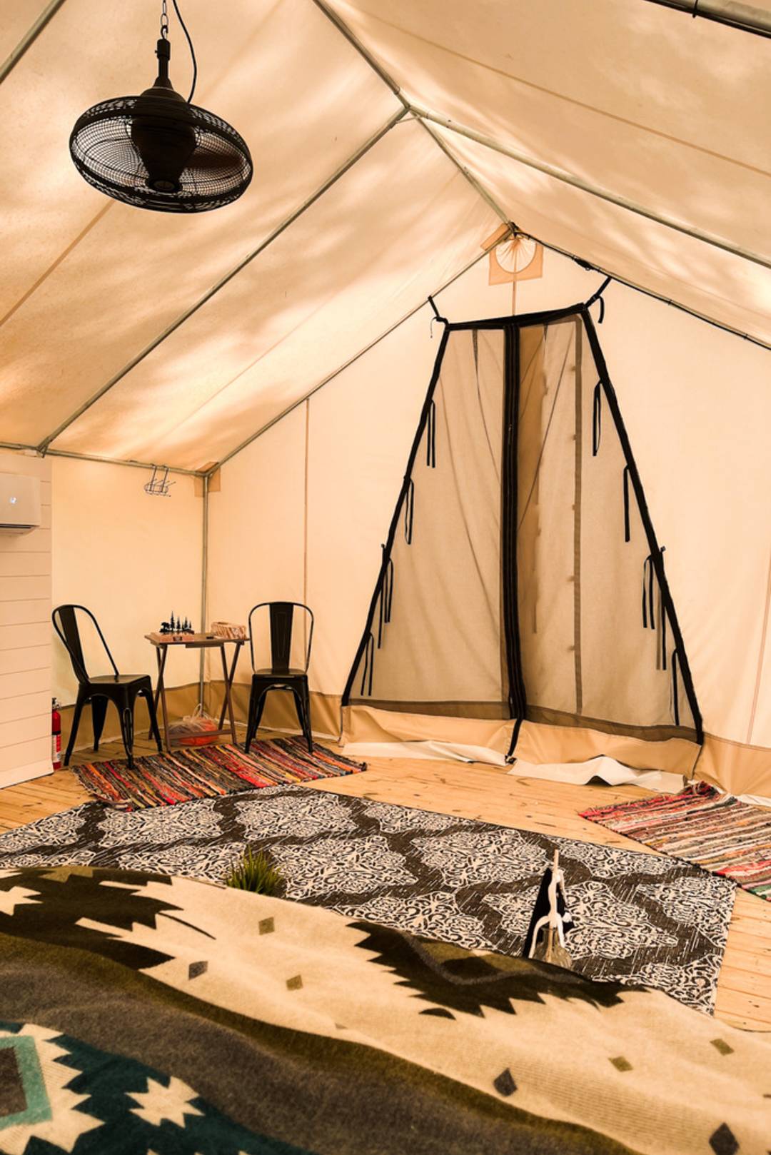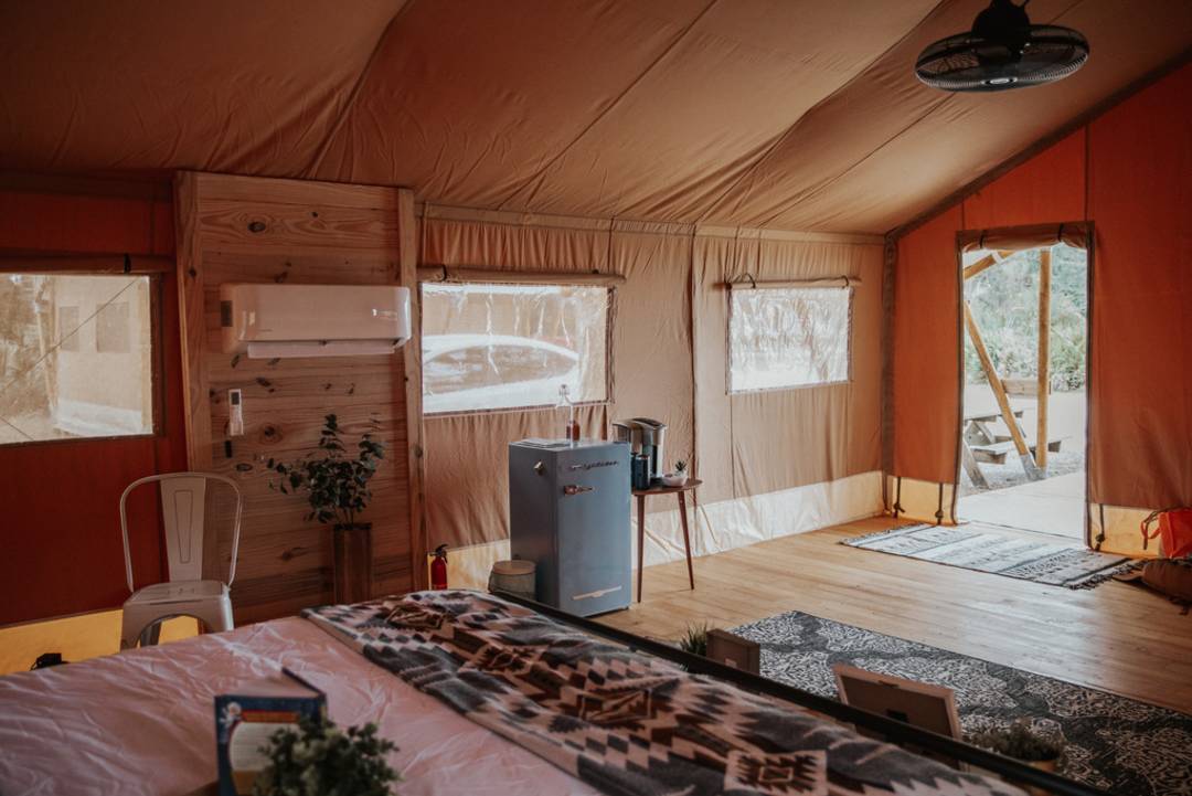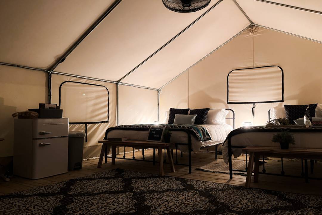 When you arrive, you’ll find a beautiful tent equipped with a supremely comfortable bed and the softest bedding. Enjoy air conditioning in the hotter months and heating during cooler periods. Each site features two hammocks, string lights, a fire pit, and a charcoal grill.