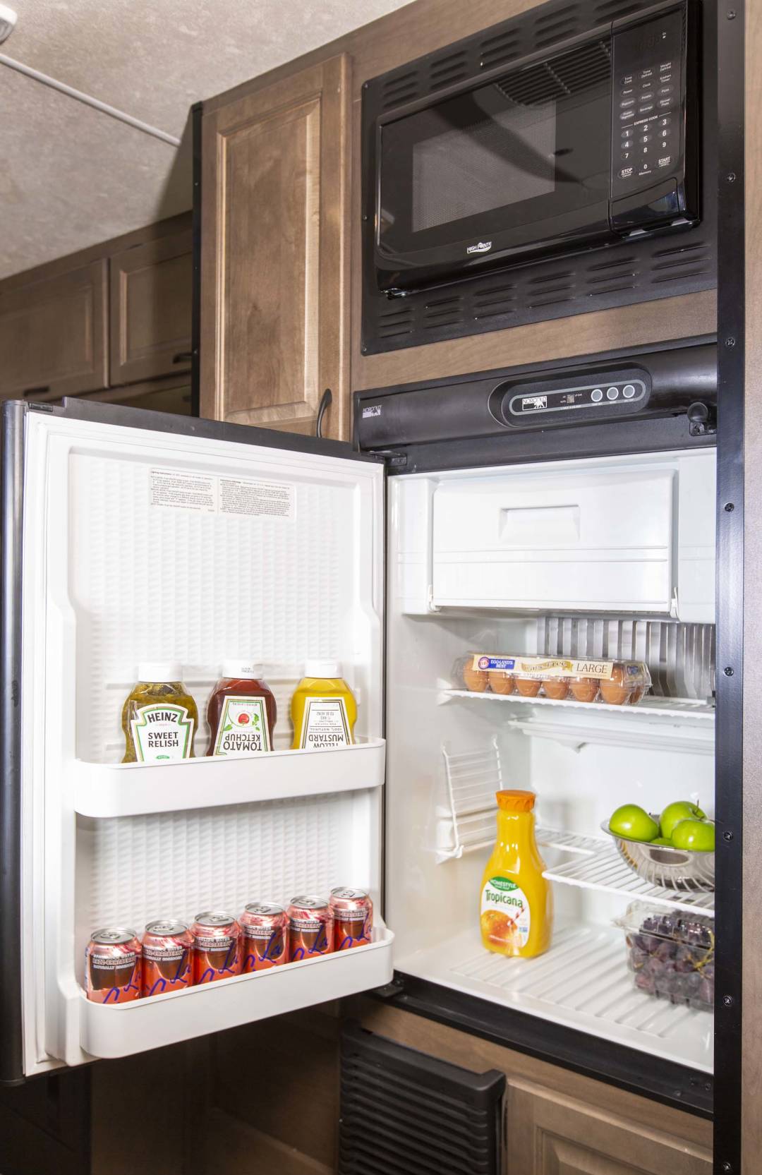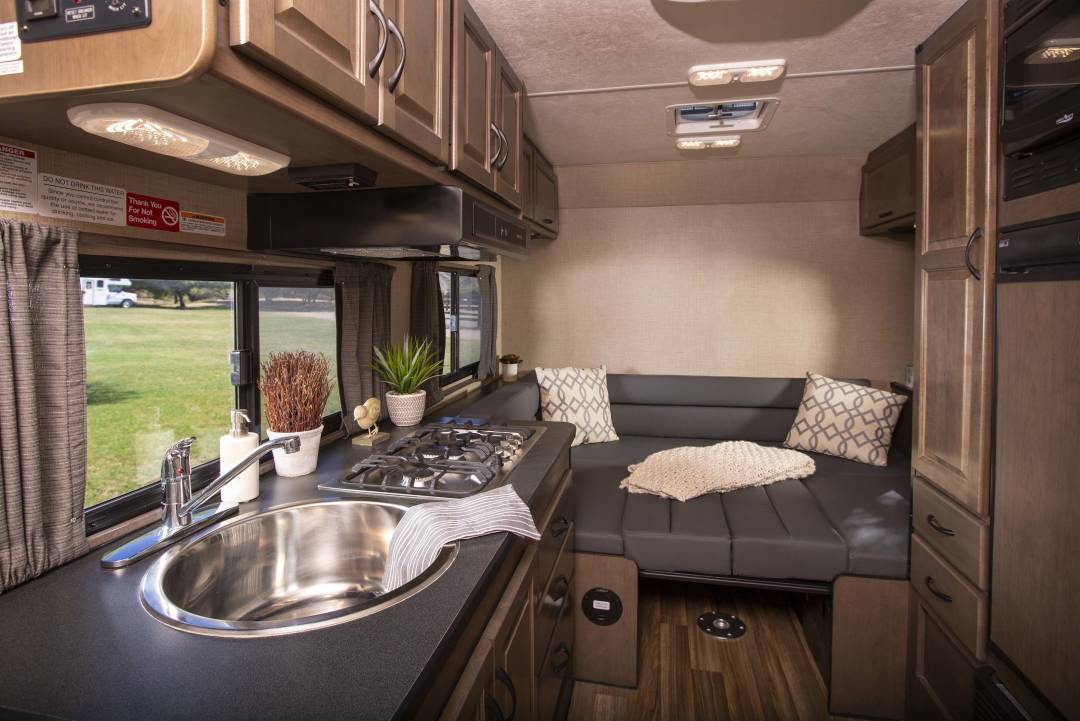 Espace modulable – Lit double au-dessus de la cabine (1,52m x 2,13m) et coin repas transformable en lit double (1,37m x 1,88m). Cuisine complète – Comprend un réchaud 3 feux, un réfrigérateur avec congélateur intégré, un micro-ondes et un évier avec eau courante.